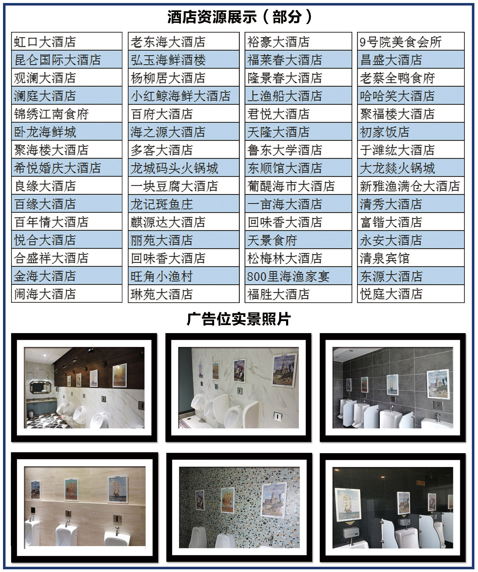 空间传媒酒店框架广告资源覆盖虹口大酒店,昆仑国际大酒店,观澜大酒店,锦绣江南大酒店,裕豪大酒店,隆景春大酒店,上渔船大酒店,澜庭大酒店等烟台六区众多中高端商务酒店及特色美食会所。